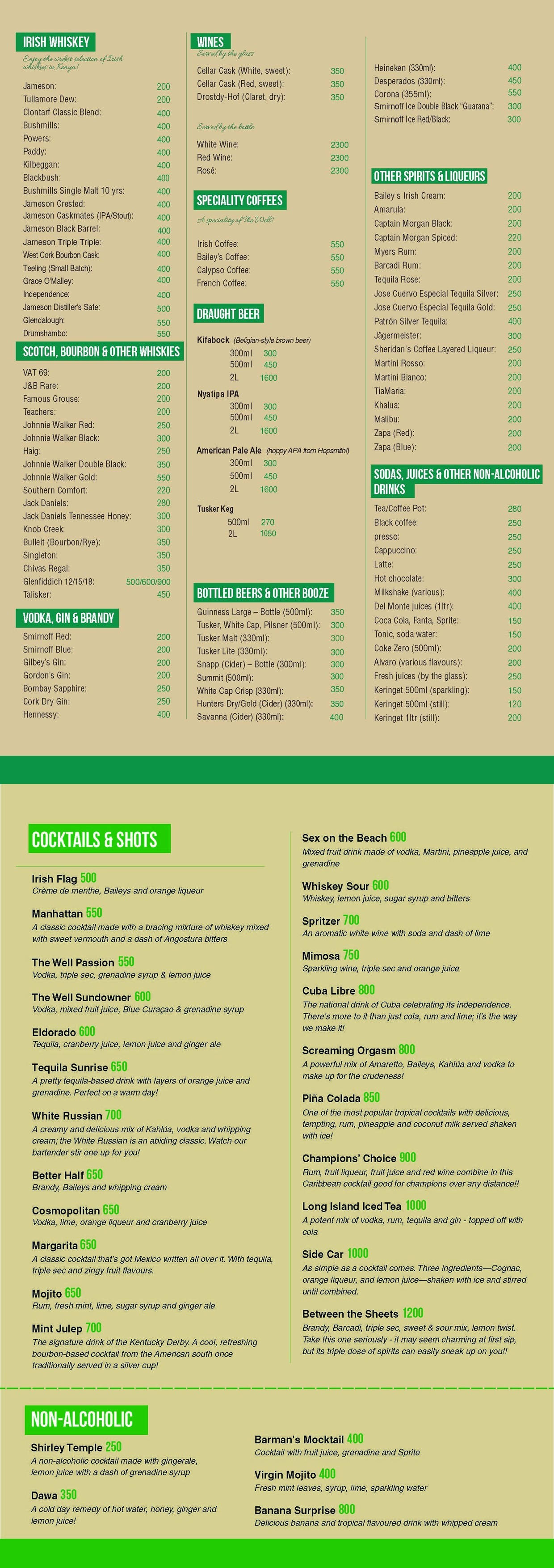 The Well has the widest selection of Irish whiskies in Kenya and probably beyond! Give one a try! Sláinte!